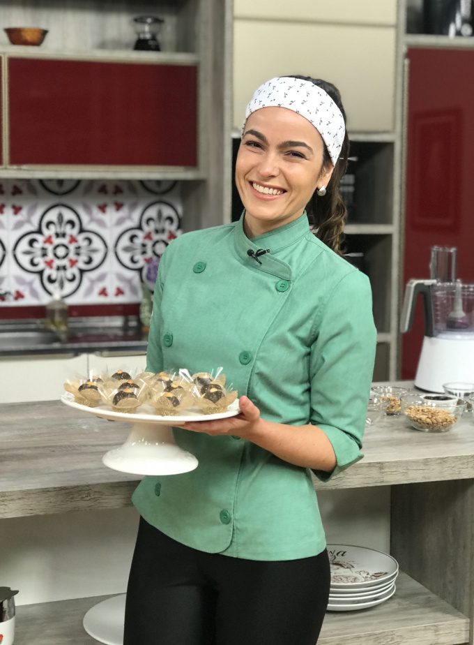 Muita gente gosta e, por isso, quando fui convidada para ir novamente ao programa Manhã Viva da TV Canção Nova, tive a ideia de preparar uma versão mais saudável do cajuzinho: o delicioso docinho de tâmara com amendoim, cacau e chia.